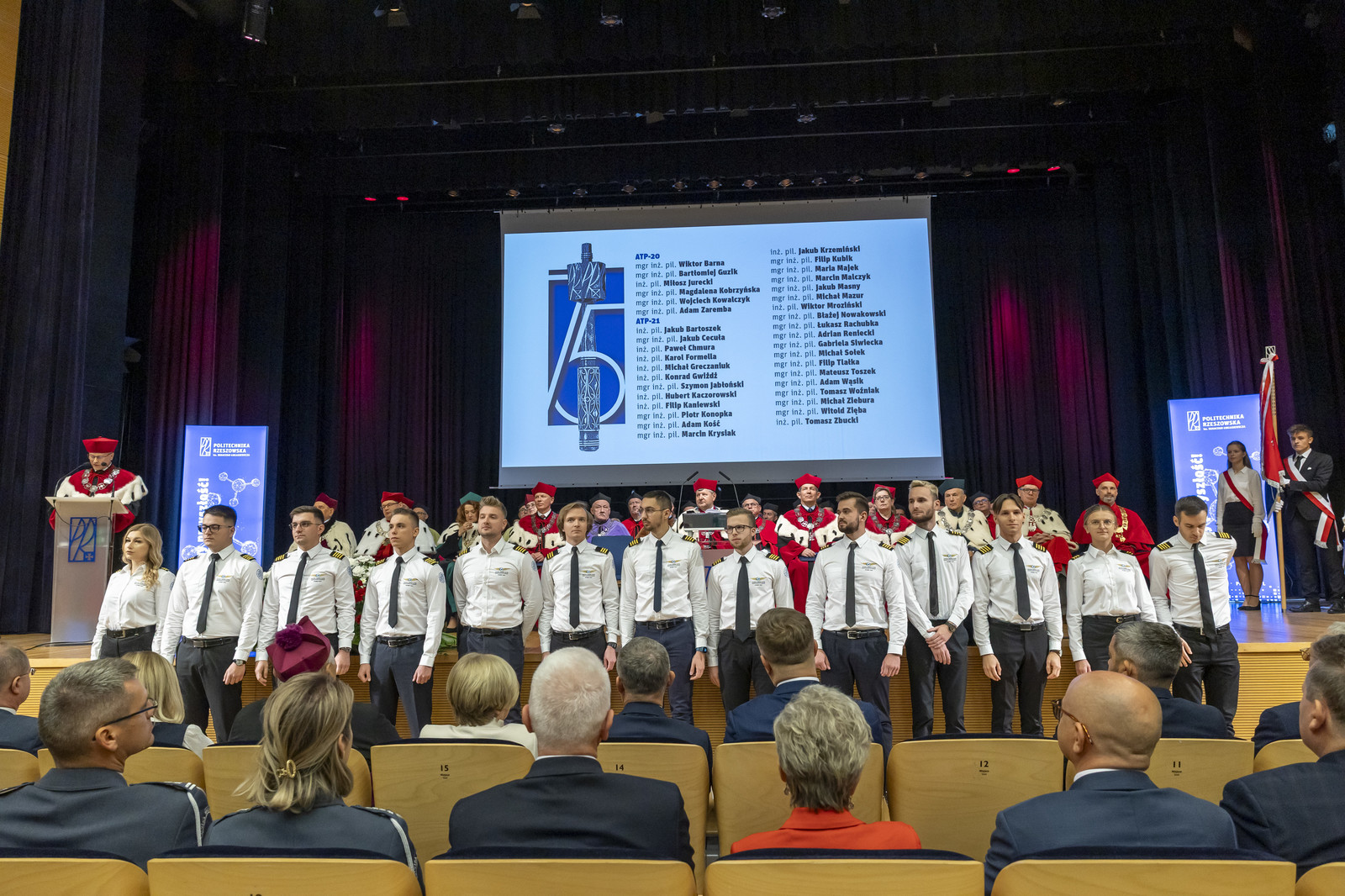 Politechnika Rzeszowska od 50 lat kształci pilotów lotnictwa cywilnego. W Ośrodku Kształcenia Lotniczego do tej pory wykształciliśmy 1261 pilotów, którzy pracują w liniach lotniczych na całym świecie. Na uroczystości kolejna grupa pilotów otrzymała certyfikaty ukończenia szkolenia do licencji pilota komunikacyjnego. Certyfikaty i pagony pilotom wręczyli JM Rektor i dyrektor Ośrodka Kształcenia Lotniczego mgr inż. pil. Tomasz Nowosielski. Miłym akcentem była informacja o nadaniu wyróżnienia prymusowi wśród lotników mgr. inż. Julii Zawidowicz przez Światowe Stowarzyszenie Lotników Polskich. Akt wyróżnienia wręczył prof. Marek Grzegorzewski.