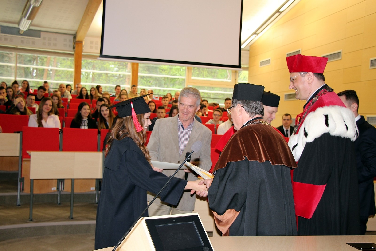 Dyplomy absolwentom uroczyście wręczyli: dr hab. inż. Grzegorz Masłowski, prof. PRz, prorektor ds. kształcenia, prof. dr hab. inż. Jarosław Sęp, dziekan WBMiL oraz dr hab. inż. Aleksander Mazurkow, prof. PRz, dziekan WMT.