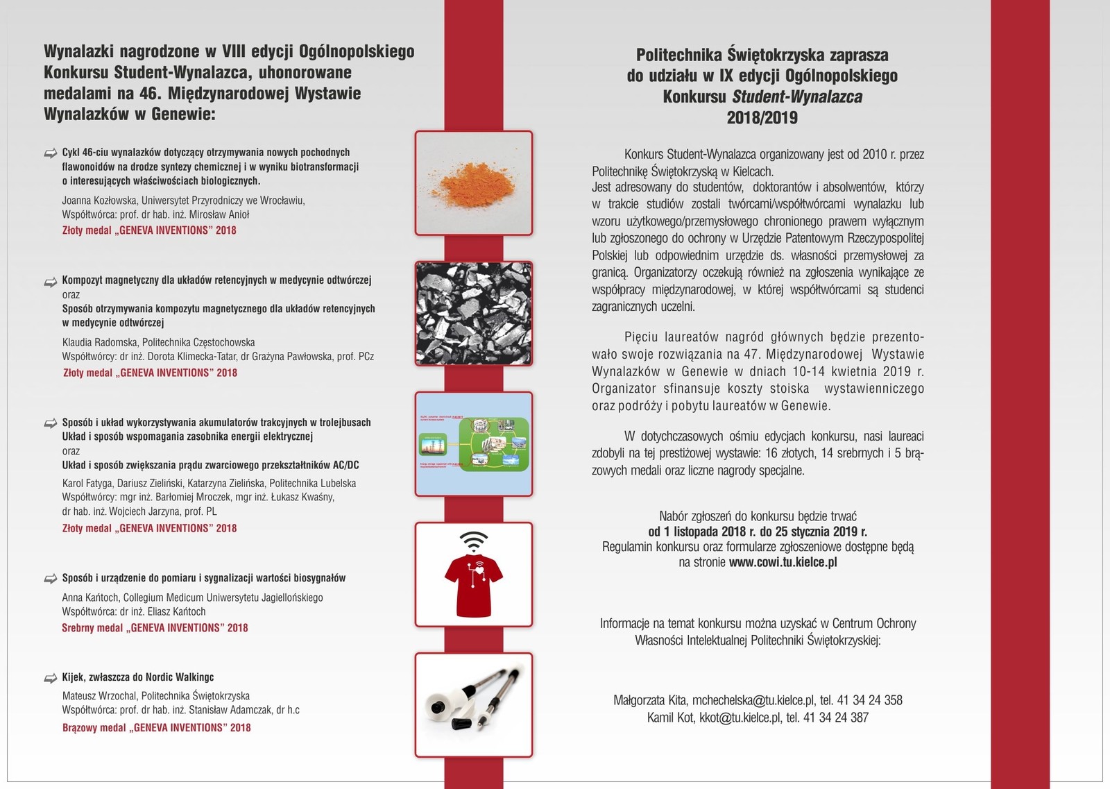 Więcej informacji na temat konkursu można uzyskać w Centrum Ochrony Własności Intelektualnej Politechniki Świętokrzyskiej www.cowi.tu.kielce.pl.