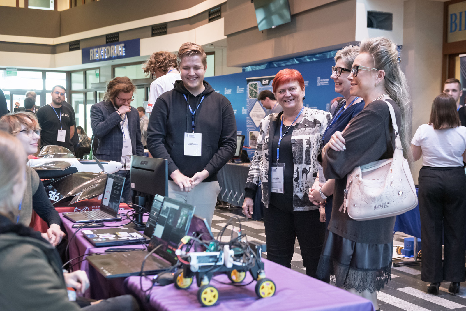 Ważnym punktem konferencji było spotkanie prorektorów z rektorem Politechniki Rzeszowskiej, prof. dr. hab. inż. Piotrem Koszelnikiem, które odbyło się w Sali Senatu PRz. Rektor przedstawił uczestnikom historię, strukturę oraz potencjał naukowy i dydaktyczny naszej uczelni. Zainteresowaniem cieszyło się spotkanie z przedstawicielami Samorządu Studenckiego, studentami specjalności „pilotaż” oraz członkami kół naukowych. Swoje osiągnięcia w formie krótkich prezentacji przedstwili studenci działający w kołach naukowych EUROAVIA, Lotników, Formuła Student i Machine Learning. Ponadto na stoiskach w holu budynku V wystawiło się kilkanaście kół z różnych wydziałów uczelni. Całość tej części wizyty koordynował pełnomocnik rektora ds. kół naukowych dr inż. Bartosz Pawłowicz. Prorektorzy mieli okazję zapoznać się z osiągnięciami studentów, obejrzeć wystawy oraz odbyć bezpośrednie rozmowy pozwalające poznać szczegóły działalności kół naukowych. Równie interesującym punktem wizyty było zwiedzanie Centrum Informacyjno-Bibliotecznego, po którym oprowadzała dyrektor dr Monika Zub.