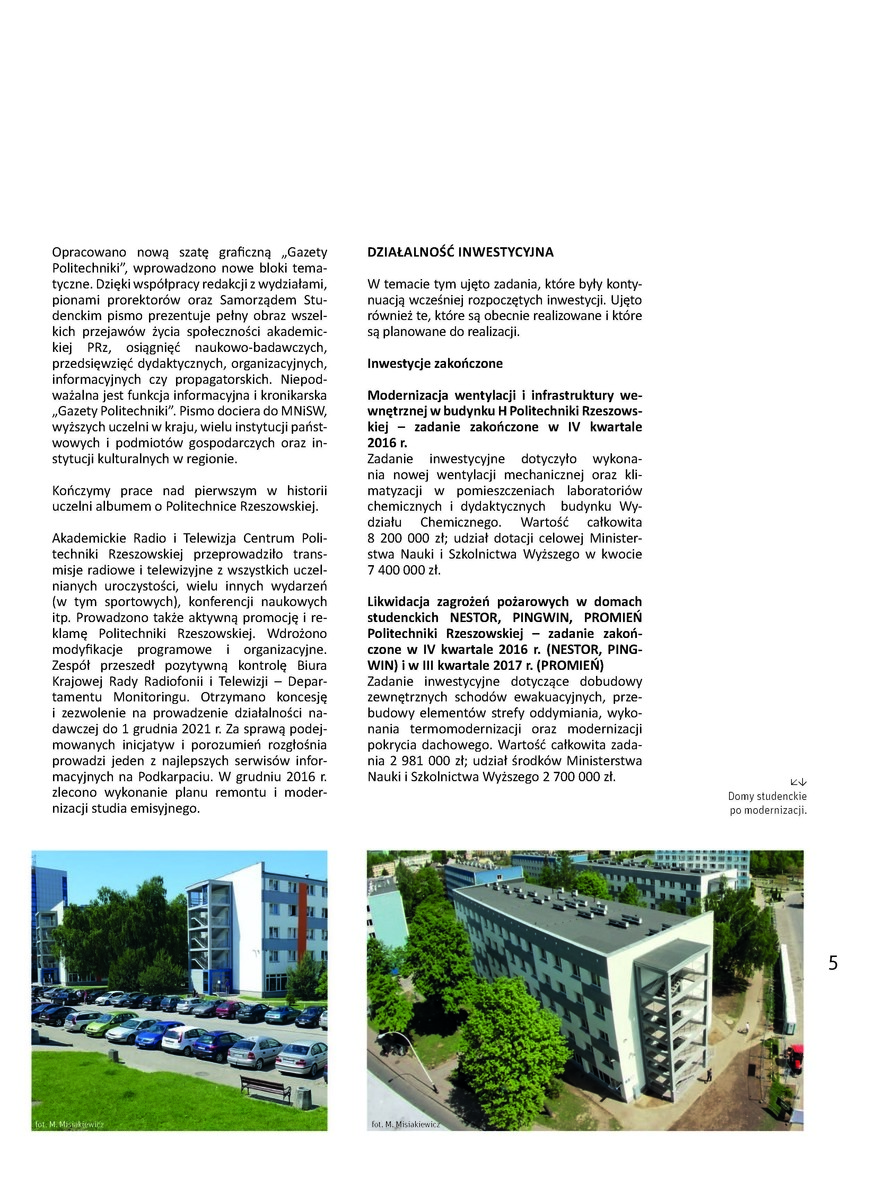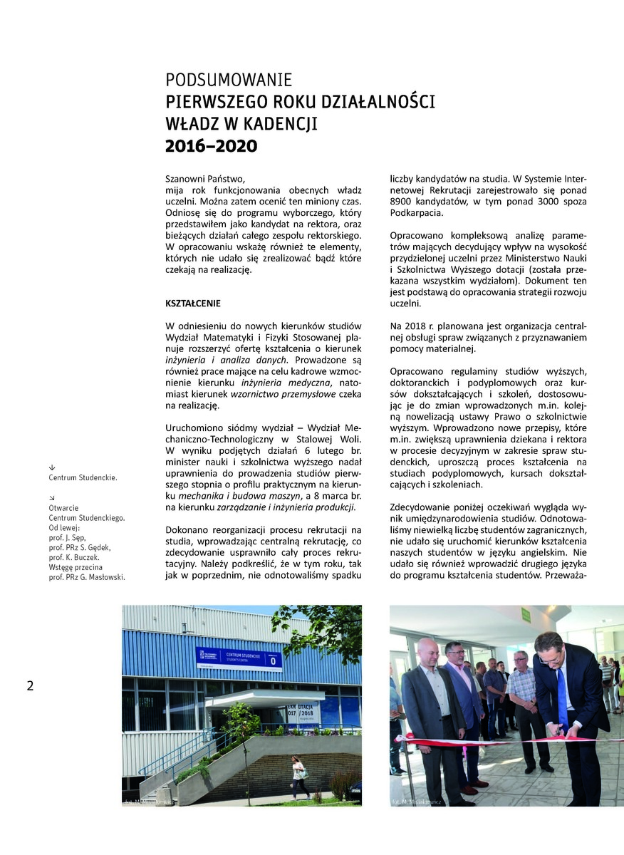 Władze Rektorskie Politechniki Rzeszowskiej przygotowały podsumowanie swojej działalności po pierwszym roku kadencji 2016-2020. Są w nim przedstawione kwestie dotyczące kształcenia, nauki, zarządzania uczelnią, współpracą z otoczeniem oraz inwestycjami. Zapraszamy do lektury tego dokumentu. Jest on również zamieszczony w najnowszym numerze „Gazety Politechniki”.